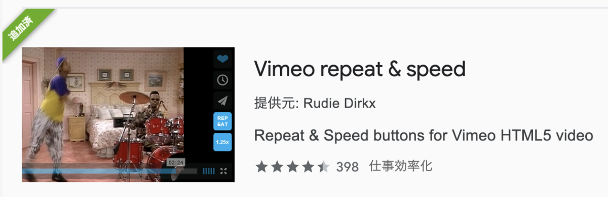 【Vimeo repeat & speed】をインストールください(下の拡張機能です)